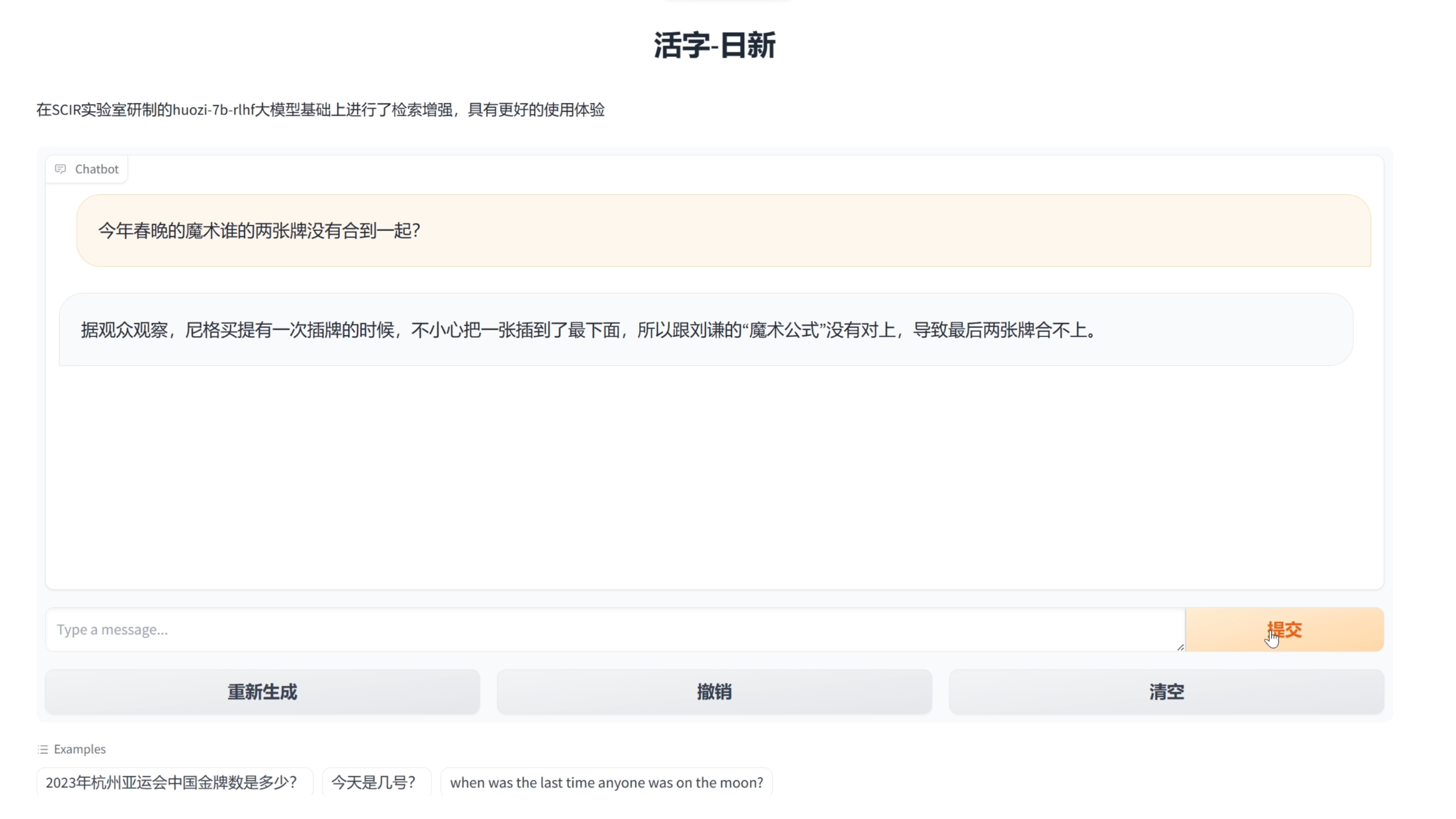 基于我们提出的检索增强框架和活字2.0,检索多种外源知识并通过拒绝采样和奖励模型打分,赋予了活字检索并利用外源知识的能力,使活字在事实性和时效性问题上有稳定的提升。实现了基于检索增强的中英文多轮对话。